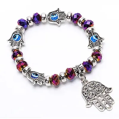 Pulseira com Pedras Roxas, Hamsa e Olho grego – Proteção Contra Mau Olhado